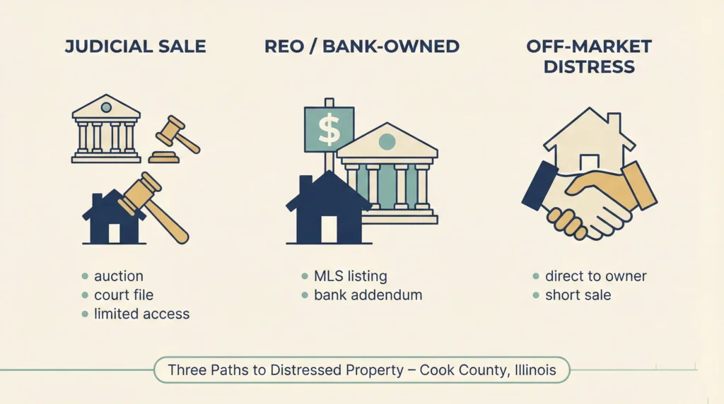 When investors talk about buying “foreclosures” in Chicago, they are usually talking about one of three paths. Each one has its own rules and its own risk profile.