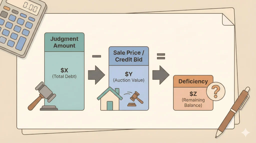 If the judgment says you owe more than the property brings at sale, the gap between those two numbers is the potential deficiency. A deficiency judgment is the court order that says you personally still owe that remaining balance after the sale.