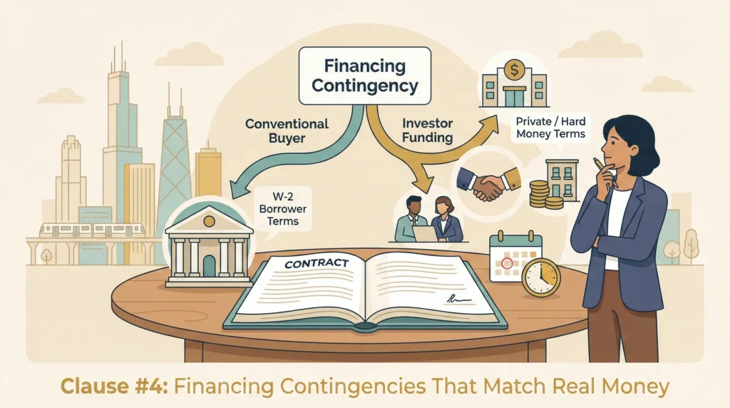 Standard financing contingencies are written for W 2 buyers getting a plain vanilla mortgage. Many Chicago investors, by contrast, are stacking hard money, private money, equity partners, or lines of credit. When you drop investor funding into an owner occupant financing clause, the language often does not fit—and you find out the hard way.