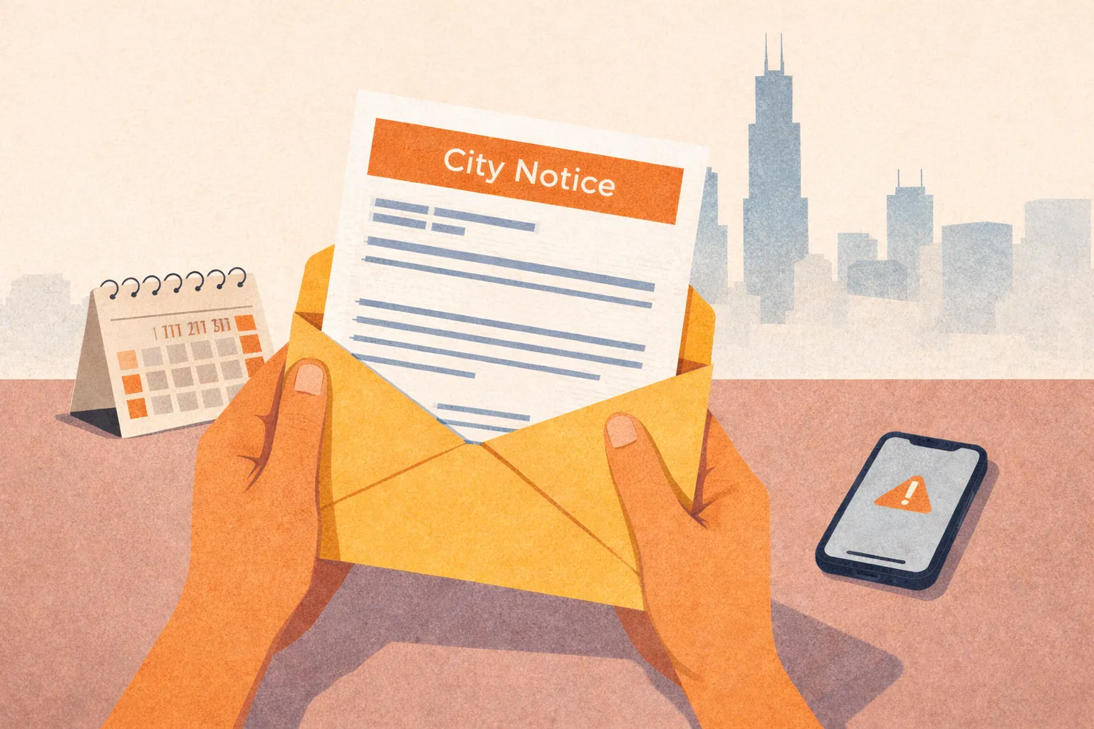 Chicago runs many building code matters through the Department of Administrative Hearings. The City explains that a notice typically tells you the alleged violation and the date, time, and location for your hearing. If you miss it, you can end up with a default.