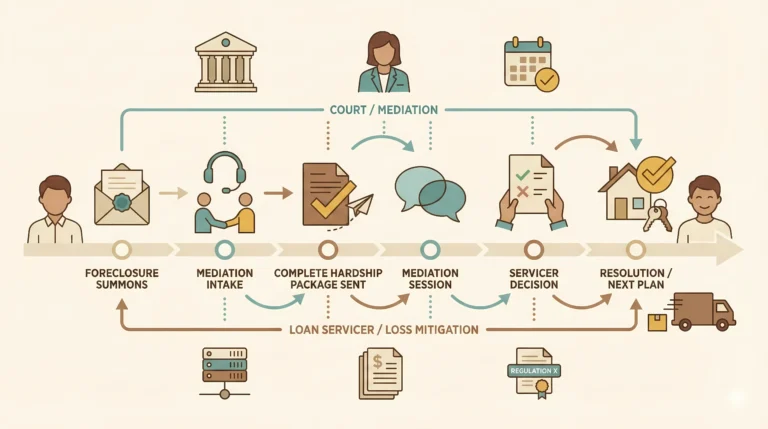• Month 2–6: Mediation intake, housing counseling, document exchange, status dates.