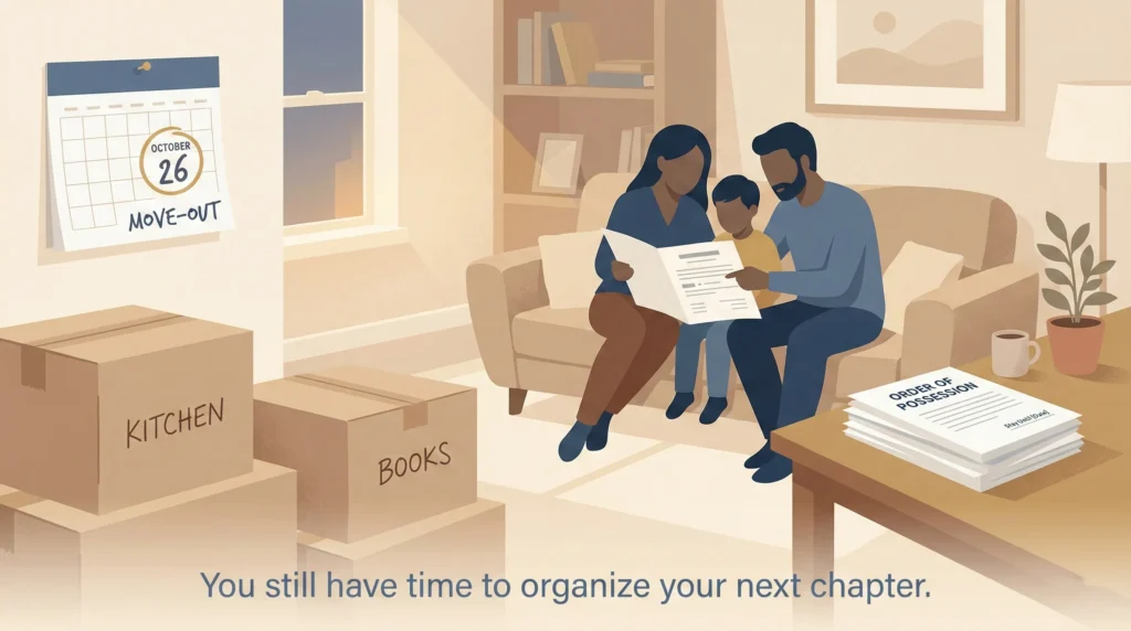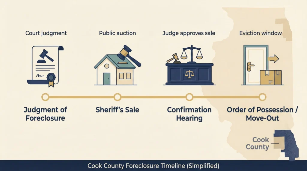 For most families, the most important question is simple: when do we actually have to leave. The answer in Cook County usually depends on two things. First, when the court enters an order of possession in favor of the purchaser. Second, how long that order is stayed before the sheriff can enforce it.